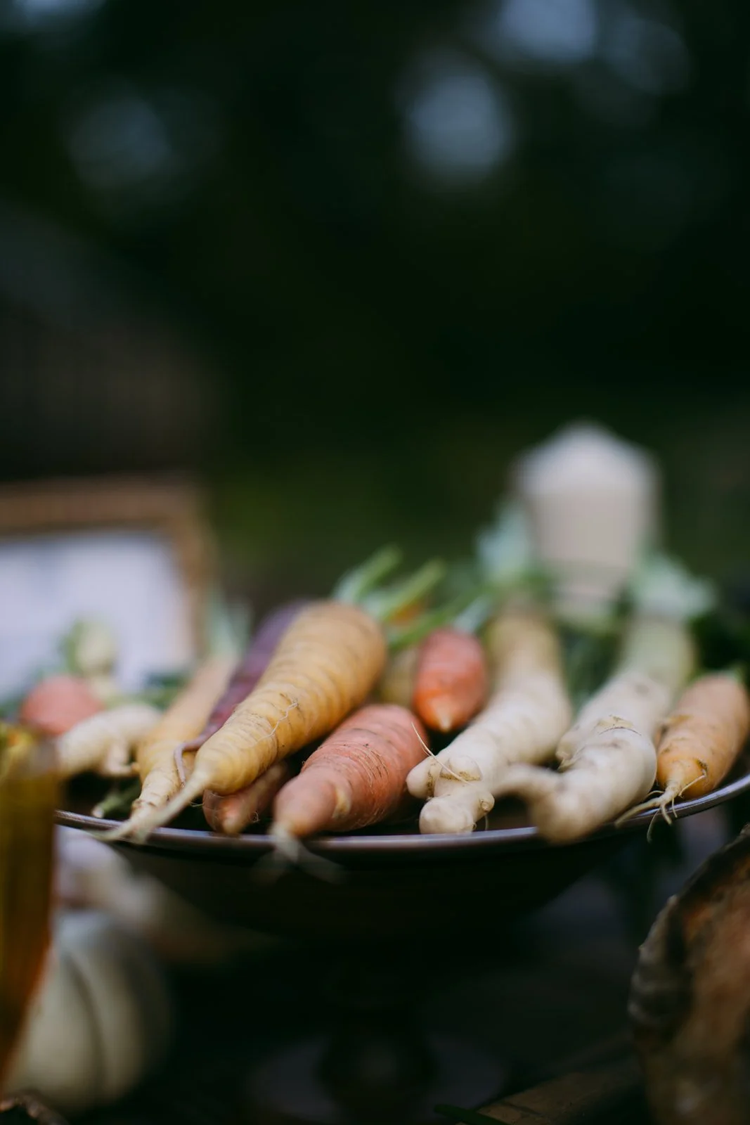 Then, it was time for Katie to work her garden magic! The colorful mix of orange, purple, and white carrots was one of my favorite things on this table. There was such a variety of sizes and colors, so it was as easy as just cutting the stems and laying the carrots in the footed bowl. Pretty easy for a centerpiece, huh?
